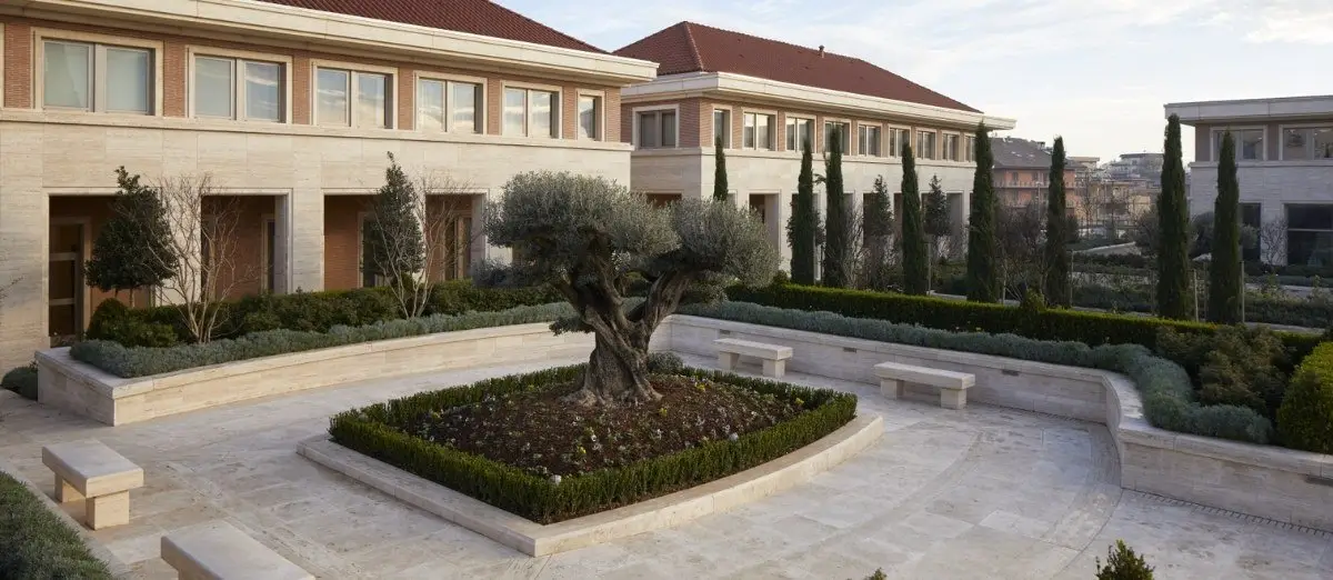 Totul din Piața Templului a fost conceput pentru a aduce un omagiu Romei și a sărbători cultura locală, inclusiv mici detalii, cum ar fi stelele recurente cu douăsprezece colțuri inspirate de Piața Campidoglio a lui Michelangelo și referiri la măslinii care erau cândva în acest loc, precum și designul general al pieței care seamănă cu un for roman antic.