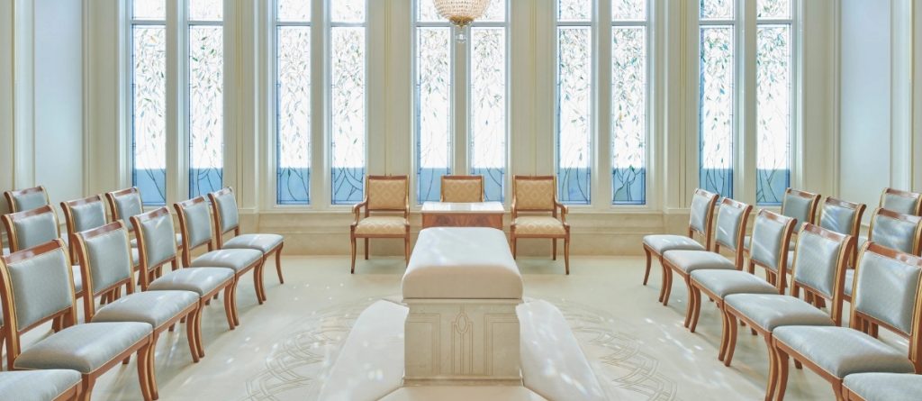 這是義大利羅馬聖殿的其中一個印證室。在耶穌基督後期聖徒教會的聖殿中,像這樣的房間裡,男女可以印證成為今生和永恆的夫妻。在婚禮儀式上,男女雙方各自立約,承諾彼此忠貞,並忠於神。 「高榮婚姻是為永生做準備的關鍵部分,」當時的羅素‧納爾遜長老在他的信息中說道。, “《天上的婚姻》” 2008年10月起。 「這要求一個人與合適的人結婚,在合適的地點,由合適的權柄主持婚禮,並忠實地遵守那神聖的聖約。」夫妻彼此忠貞,也忠於他們的子女。男女在聖殿中受印證後所生的子女,都與父母印證在一起。 「由此結合所生的子女是『主的產業』。當一個家庭在聖殿中受印證後,這個家庭就如同神的國度一樣永恆。」聖殿使家庭成員在去世後仍能保持長久的聯繫。.